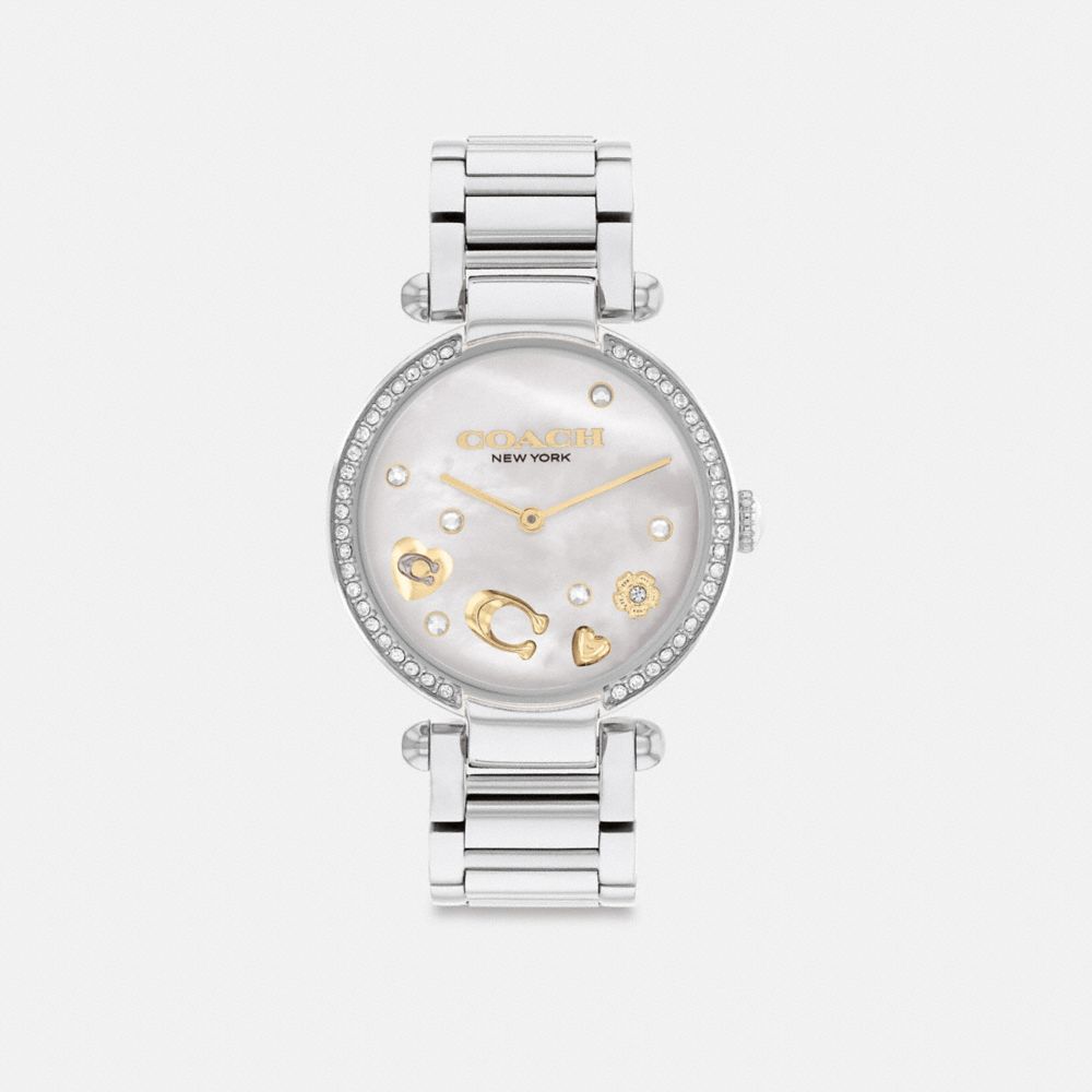 Timeless and elegant, the Cary watch is a sophisticated style perfect for day or night. The sleek stainless steel bracelet design features a shimmering crystal bezel and a luminous mother-of-pearl dial detailed with gold tone accents and a floating scatter of our signature charms.