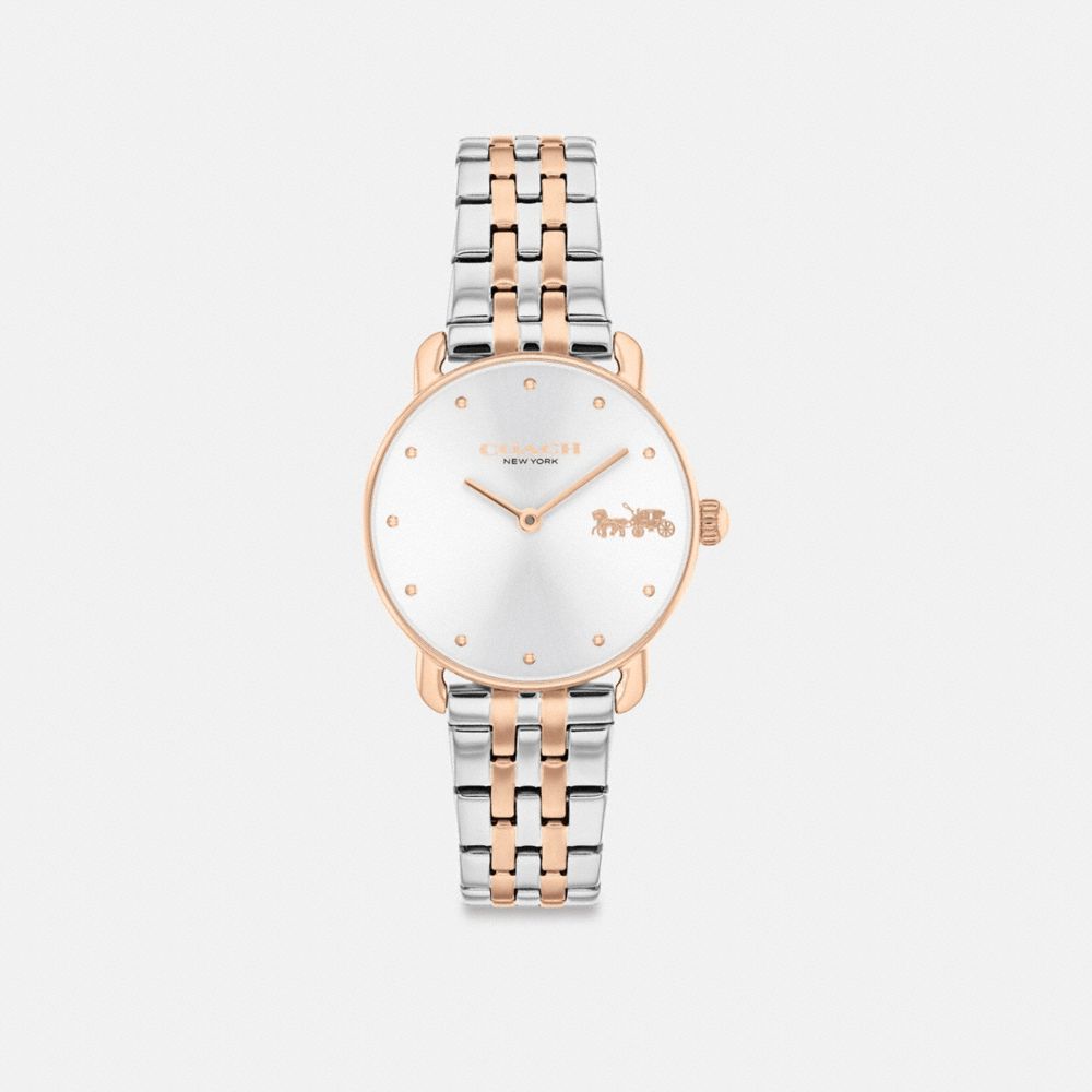 With clean lines and a modern minimalist sensibility, the Elliot is a true design classic ready for workdays and weekends. This two-tone stainless steel and gold tone bracelet watch features a dial detailed with dome markers and our iconic Horse and Carriage motif at 3 o’clock for a heritage touch.