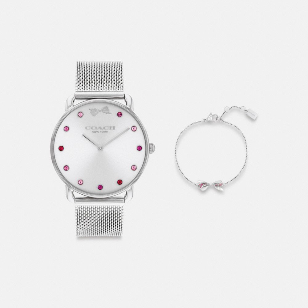 With clean lines and a modern minimalist sensibility, the Elliot is a true design classic ready for workdays and weekends. This polished Gift Set includes a stainless steel mesh bracelet timepiece featuring a sunray dial detailed with a delicate bow and vibrant crystal markers, along with an adjustable bracelet accented with a sparkling crystal-embellished bow. Wear together or separately.