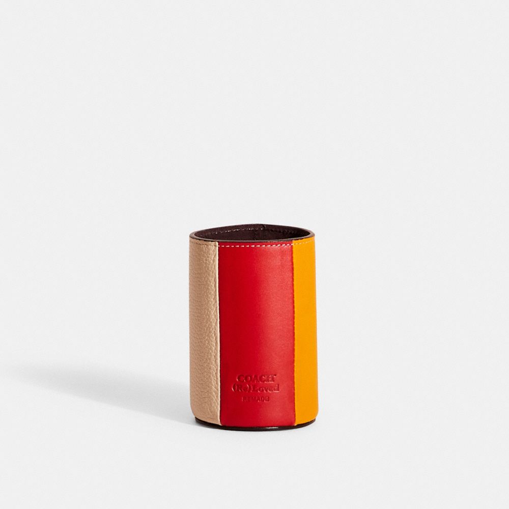 Who says you can’t teach an old bag new tricks? This very special colorblock Coach Remade design is crafted of raw materials salvaged from pre-owned bags at our Coach Repair Workshop to create something completely new. Maximizing the life of our leather—and minimizing landfill waste—this one-of-a-kind Pencil Holder adds a luxurious touch to your workspace to organize pens, pencils or markers and reflects our commitment to rethinking and reducing our impact on the planet. (And proves that some things are even better the second time around.)
