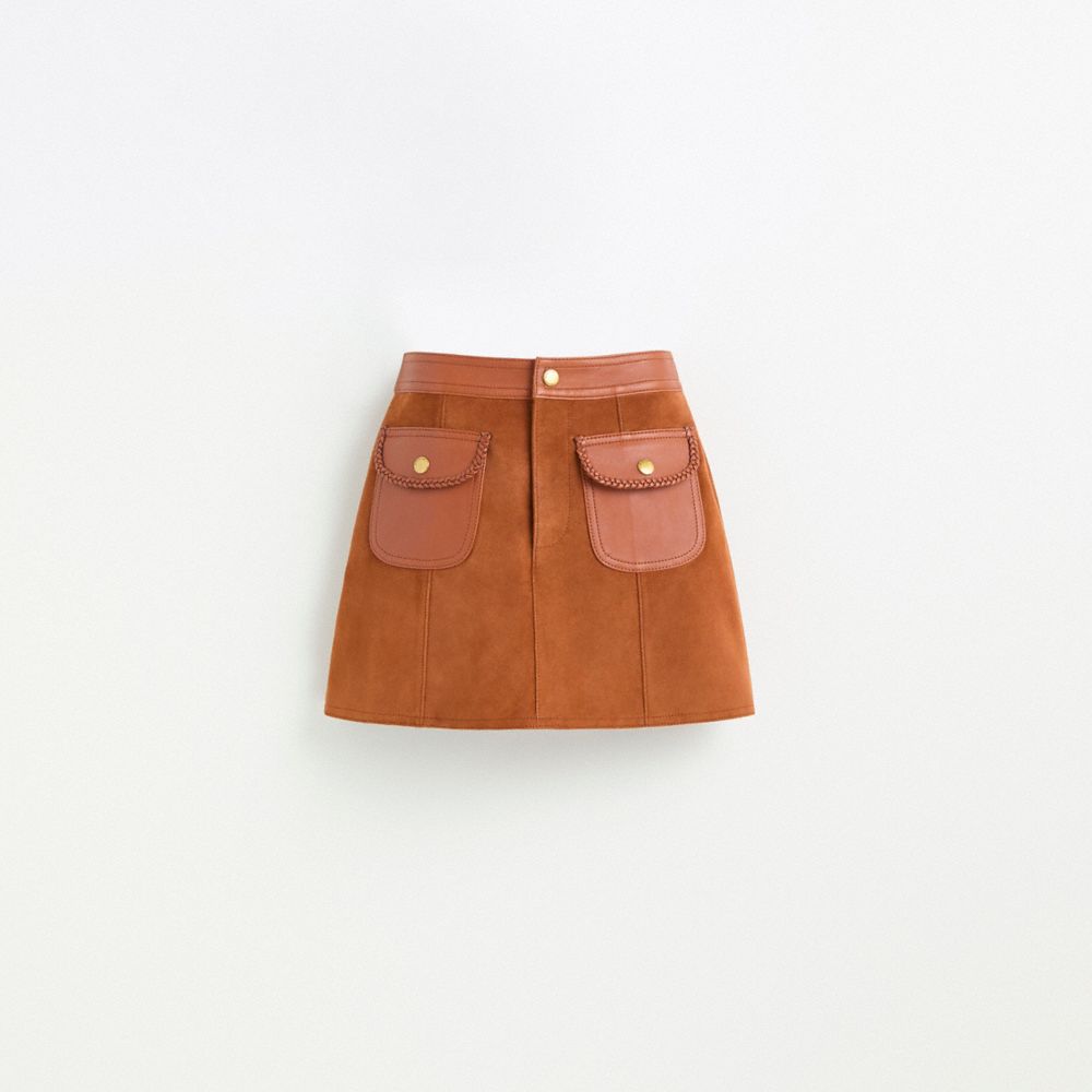 Crafted for compliments, this velvety soft suede mini skirt features smooth leather flap pockets detailed with hand-braided leather trim for rich dimension in a nod to our heritage of fine craftsmanship. It's finished with a leather waistband and Signature lining.