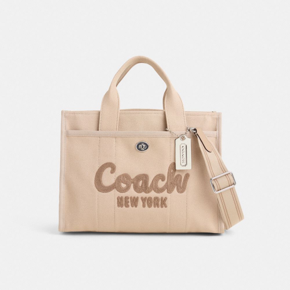 Carry as much (or as little) as you like with our lightweight Cargo tote. Detailed with our cursive Coach script embroidery and iconic turnlock closure, this spacious carryall has an open interior with room for a 13" laptop, two outside pockets for easy organization and a removable webbing strap for shoulder or crossbody wear. Crafted to last, this versatile style is crafted of cotton sourced from farms that use regenerative agricultural practices* and inspired by our commitment to reducing our impact on the planet. Now no matter where you go with it, you’ll always be toting around a little extra love for the planet.