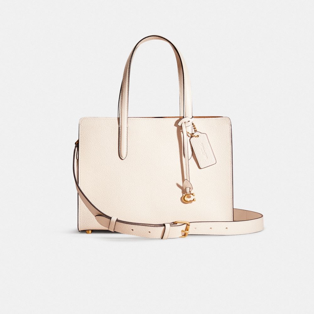 Perfectly put-together, our minimalist Carter carryall features three organized compartments, multifunction pockets and space for a 10” laptop. This polished pebble leather 28 is finished with a detachable crossbody strap and our C dangle charm.