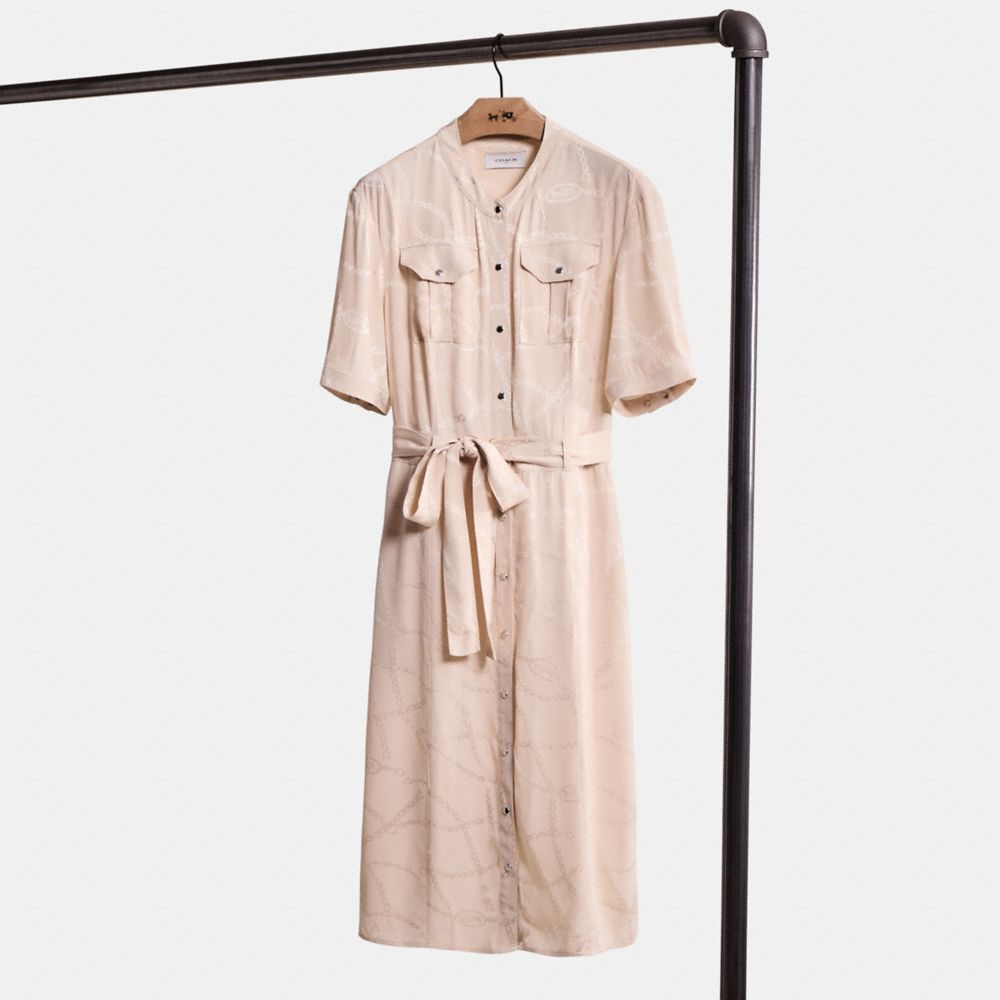 Connect the link between casual and dressy with our versatile shirtdress. Crafted of lightweight chain-print jacquard, the A-line style features a banded collar, a snap-front and camp-inspired patch pockets.