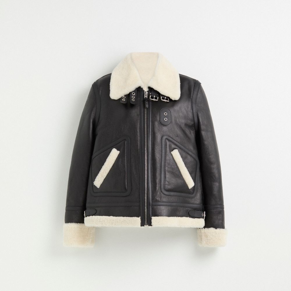 This aviator jacket is based on iconic vintage military styles. An oversized shearling collar and shearling-lined pockets offer style and warmth.