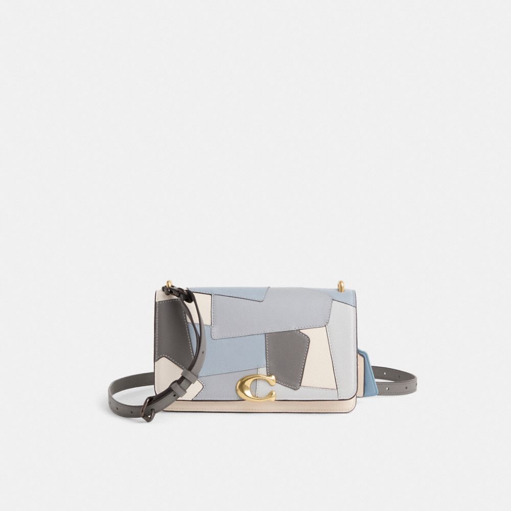 Reimagined with a distinctive patchwork by Eunice Chang featuring sophisticated shades of grey and blue leather, this flap-front style has been expertly cleaned, conditioned and restored. Our talented craftspeople Jose Reyna, Alfred Deaza and Yngrid Pichardo Baez hand-decorated the flap with Coach remnants, replaced the back pocket with a grey leather one, then added a long strap with dogleashes and a playful repurposed charm. Detailed with our C pushpin closure, the Bandit is crafted of luxe refined leather with a high shine finish. It features two organized compartments, a secure interior snap pocket and a shoulder strap that adjusts for crossbody wear.