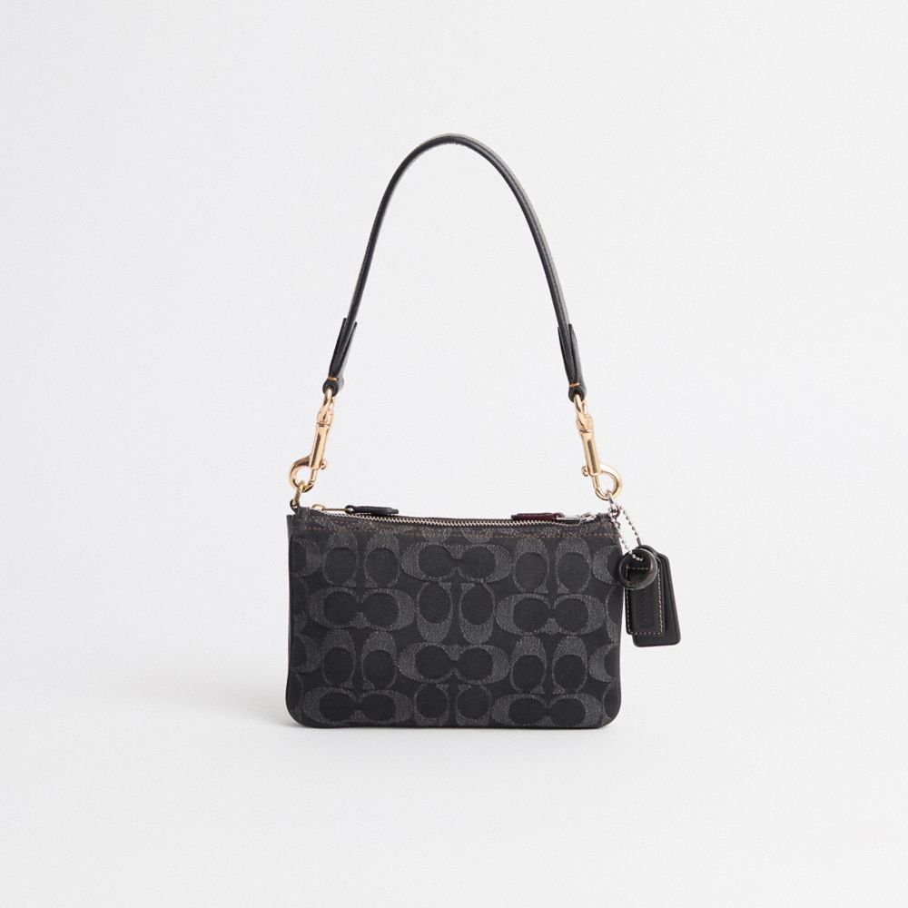 Reimagined from individual wristlets into a chic shoulder bag by Savannah Sutton with twice the space and twice the organization, this hybrid style has been expertly cleaned, conditioned and restored. Our talented craftsperson Nicole Izquierdo sewed two wristlets back-to-back, repaired threading on denim wristlet, attached anchors, then added a repurposed short strap with dogleash clips and playful charm. One wristlet is crafted of our darkly dramatic black Signature denim with smooth leather details and the other is crafted of polished pebble leather detailed with our Signature hardware. Each one is perfectly sized for cards, cash and a phone.
