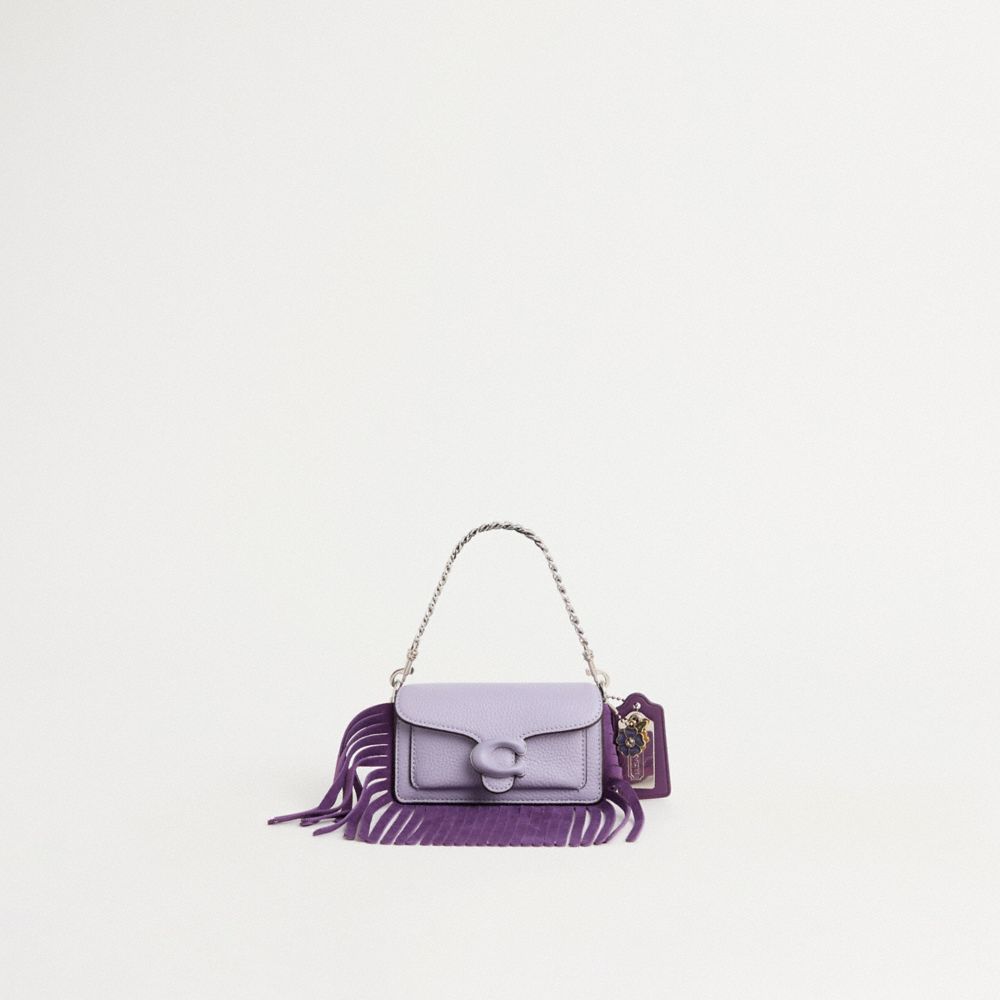 Reimagined by Eunice Chang with an elegant silver chain strap and a sweep of dense tonal fringe for a sophisticated finish, this mini design has been expertly cleaned, conditioned and restored. Our talented craftspeople Jose Reyna and Yngrid Pichardo Baez attached swingy leather fringe detail along the edges, then added a chain strap and a playful repurposed charm. Finished with our tonal leather-covered Signature hardware for an iconic touch, our Tabby 12 is crafted of polished pebble leather and refined leather. The versatile design features two detachable straps to carry by hand or wear crossbody and a dual gusset interior to organize cash, cards, ear buds, and keys.