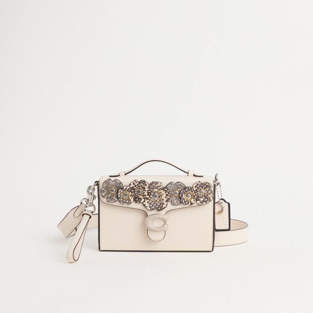 Reimagined with an exotic touch by Eunice Chang featuring a smattering of our Tea Rose appliqué in genuine snakeskin, this flap-front style has been expertly cleaned, conditioned and restored. Our talented craftspeople Alfred Deaza and Yngrid Pichardo Baez hand-decorated the flap with luxe dimensional blooms, re-covered the Signature, then added a keeper to the strap and a playful repurposed charm. A modern take on an archival 1970s Coach design, our structured geometric Tabby box bag is crafted of buttery soft glovetanned leather. Finished with our Signature hardware, it features an expandable accordion opening for a little extra room when needed. The convenient convertible style can be worn four ways: as a wristlet, held by the top handle, slung on the shoulder or crossbody with the detachable adjustable strap.