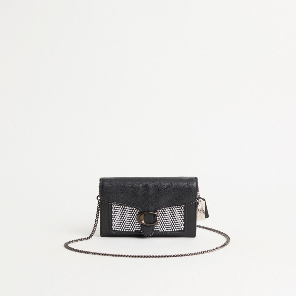 Reimagined by Eunice Chang with a pop of glistening crystals for a shimmering accent, this flap-front style has been expertly cleaned, conditioned and restored. Our talented craftspeople Jose Reyna and Alfred Deaza replaced the front pocket with a crystal-embellished one finished with edge binding, repaired the hardware, switched out the D-rings and Signature hardware, then added a playful repurposed charm. A modern take on an archival 1970s Coach design, our structured Tabby clutch is crafted in a mix of polished pebble leather and refined leather detailed with gleaming beadchain trim. Finished with our Signature hardware, this organized, three compartment design has a secure interior zippered compartment and an exterior slip pocket for easy access to essentials. It can be carried as a clutch without the elegant chain strap or worn crossbody, making it the perfect choice for both dressed up and casual looks.